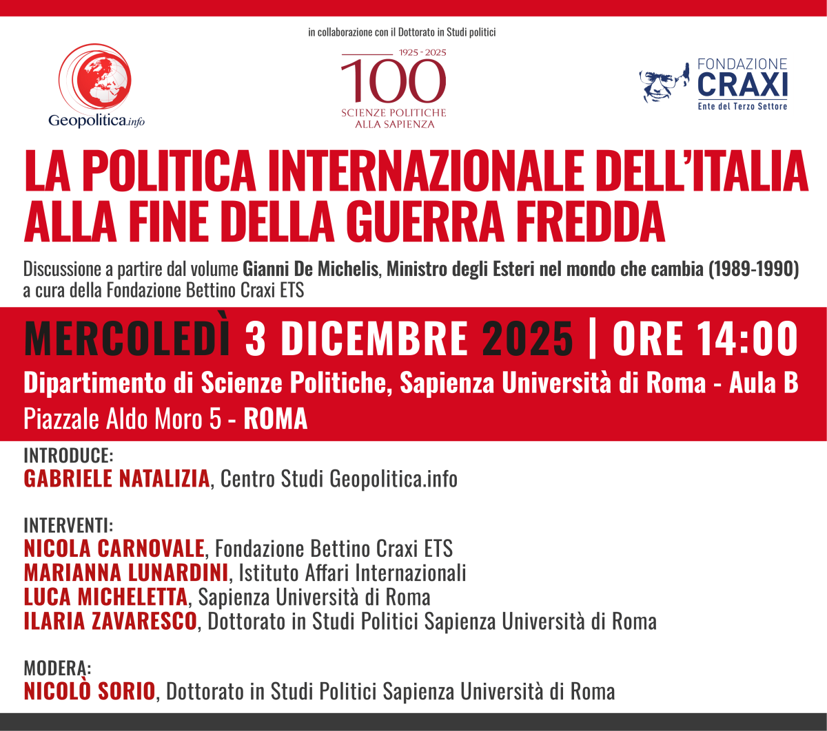 L’iniziativa è organizzata dal Centro Studi Geopolitica.info e la Fondazione Bettino Craxi ETS, in collaborazione con il Dottorato in Studi Politici di Sapienza Università di Roma.