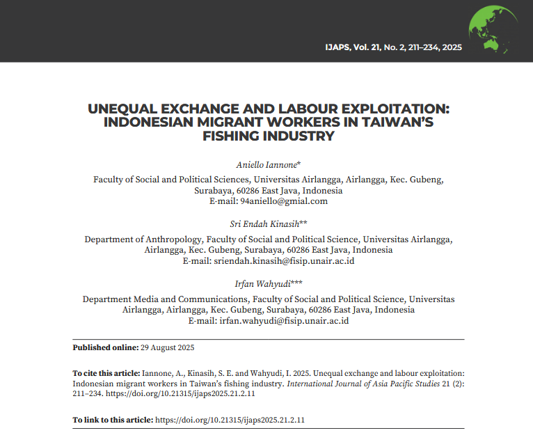 Homepage > Pubblicazioni > Unequal Exchange and Labour Exploitation: Indonesian Migrant Workers in Taiwan’s Fishing Industry Unequal Exchange and Labour Exploitation: Indonesian Migrant Workers in Taiwan’s Fishing Industry Di Aniello Iannone Unequal Exchange and Labour Exploitation: Indonesian Migrant Workers in Taiwan’s Fishing Industry Rivista: International Journal of Asia Pacific Studies Volume: 21Numero: 2Anno di edizione: 2025Pagine: 211-234 Condividi: Facebook Twitter LinkedIn Instagram Copia link Gli Autori Aniello Iannone Contenuti correlati Uncategorized 16 Apr 2026 The Structural Roots of Italy’s Expanding Foreign Military Deployments 20 Feb 2026 Diffusione dell’insicurezza e instabilità internazionale. Un’interpretazione strutturale 20 Feb 2026 Preservare il momento unipolare. L’approccio strategico dell’Amministrazione Trump nella NSS-17 20 Feb 2026 Building a new strategic partnership: Trust and the deepening security cooperation between Japan and Italy